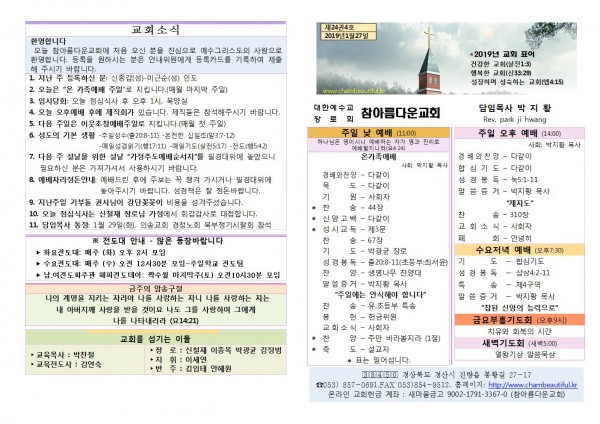 주보- 2019년 1월 27일 페이지 정보 작성자 참아름다운교회 댓글 0건 조회 10,871회 19-02-02 10:45 본문 주보- 2019년 1월 27일 목 록 답 변 이전글주보- 2019년 2월 3일 19.02.04 다음글주보- 2019년 1월 20일 19.01.22 댓글목록 댓글목록 등록된 댓글이 없습니다.