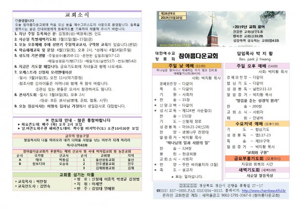 주보- 2019년 3월 10일 페이지 정보 작성자 참아름다운교회 댓글 0건 조회 11,026회 19-03-10 13:56 본문 주보- 2019년 3월 10일 목 록 답 변 이전글주보- 2019년 3월 17일 19.03.17 다음글주보- 2019년 3월 3일 19.03.03 댓글목록 댓글목록 등록된 댓글이 없습니다.