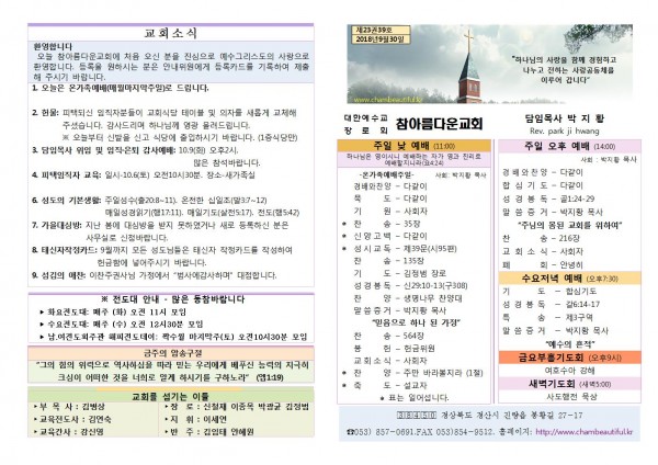 주보-2018년 9월 30일 페이지 정보 작성자 참아름다운교회 댓글 0건 조회 11,000회 18-10-10 15:19 본문 . 목 록 답 변 이전글주보-2018년 10월 7일 18.10.10 다음글주보-2018년 9월 23일 18.09.28 댓글목록 댓글목록 등록된 댓글이 없습니다.