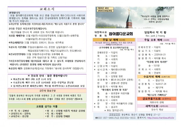 주보-2018년 10월 28일 페이지 정보 작성자 참아름다운교회 댓글 0건 조회 10,527회 18-10-30 15:40 본문 . 목 록 답 변 이전글주보-2018년 11월 4일 18.11.06 다음글주보-2018년 10월 21일 18.10.23 댓글목록 댓글목록 등록된 댓글이 없습니다.