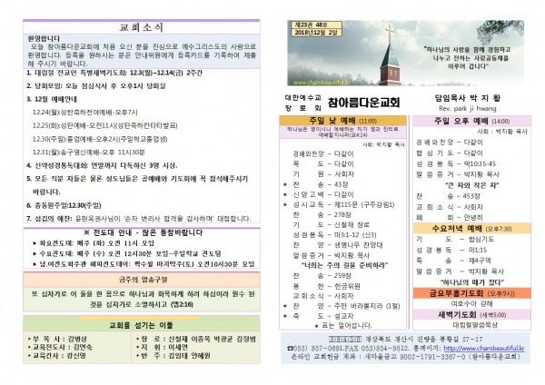 주보-2018년12월 2일 페이지 정보 작성자 참아름다운교회 댓글 0건 조회 10,752회 18-12-04 11:19 본문 . 목 록 답 변 이전글주보-2018년 12월 9일 18.12.11 다음글주보-2018년 11월 25일 18.11.25 댓글목록 댓글목록 등록된 댓글이 없습니다.