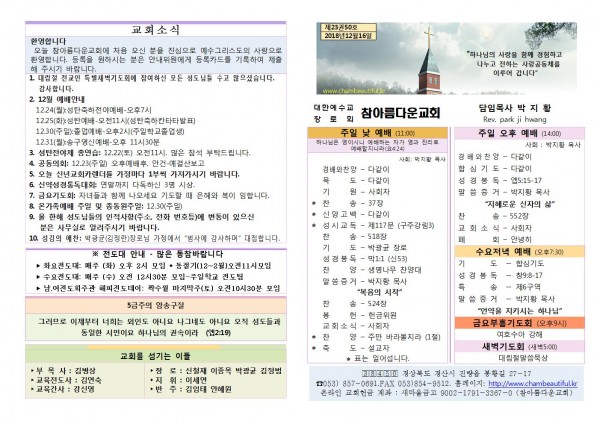 주보-2018년 12월 16일 페이지 정보 작성자 참아름다운교회 댓글 0건 조회 10,830회 18-12-18 11:40 본문 지난주일 주보입니다. 목 록 답 변 이전글주보-2018년 12월 23일 18.12.26 다음글주보-2018년 12월 9일 18.12.11 댓글목록 댓글목록 등록된 댓글이 없습니다.