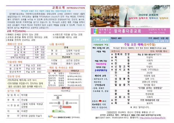 2024년 12월 8일 페이지 정보 작성자 최고관리자 댓글 0건 조회 3,218회 24-12-10 14:54 본문 참아름다운교회 2024년 12월 8일 주보입니다. 목 록 답 변 이전글2024년 12월 15일 24.12.14 다음글주보-2024년 11월 24일 24.11.25 댓글목록 댓글목록 등록된 댓글이 없습니다.