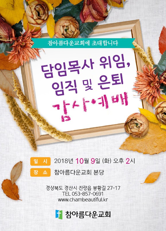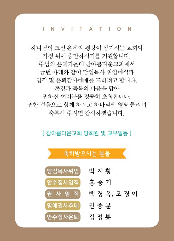 위임식 및 임직식,은퇴식 초청장 페이지 정보 작성자 참아름다운교회 댓글 0건 조회 11,048회 18-09-22 14:14 본문 ... 목 록 답 변 이전글위임,임직 및 은퇴 순서지 18.10.15 다음글위임식 및 임직식,은퇴식 일정 18.09.17 댓글목록 댓글목록 등록된 댓글이 없습니다.