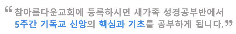 참아름다운교회에 등록하시면 새가족 성경공부반에서 5주간 기독교 신앙의 핵심과 기초를 공부하게 됩니다.